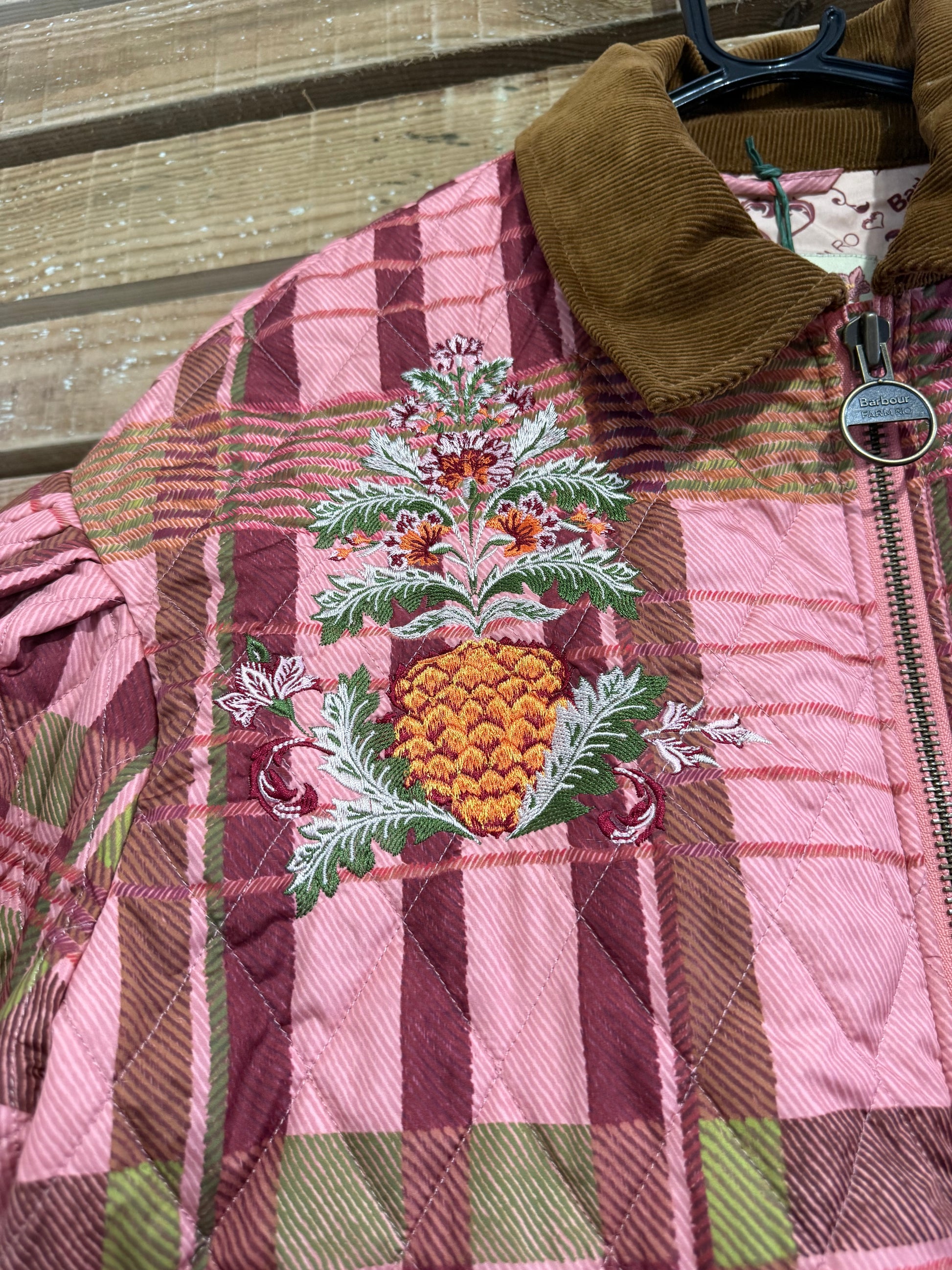 BNWT Barbour x Farm Rio Ana-Clara Quilted Jacket. Pink patchwork. Size Medium