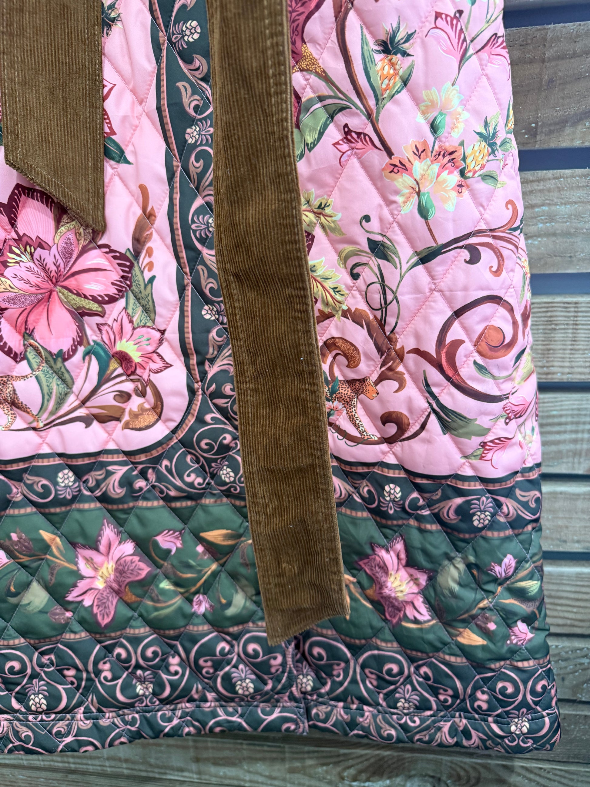 BNWT Barbour x Farm Rio Cami Quilted Jacket. Pink patchwork. Size XS.