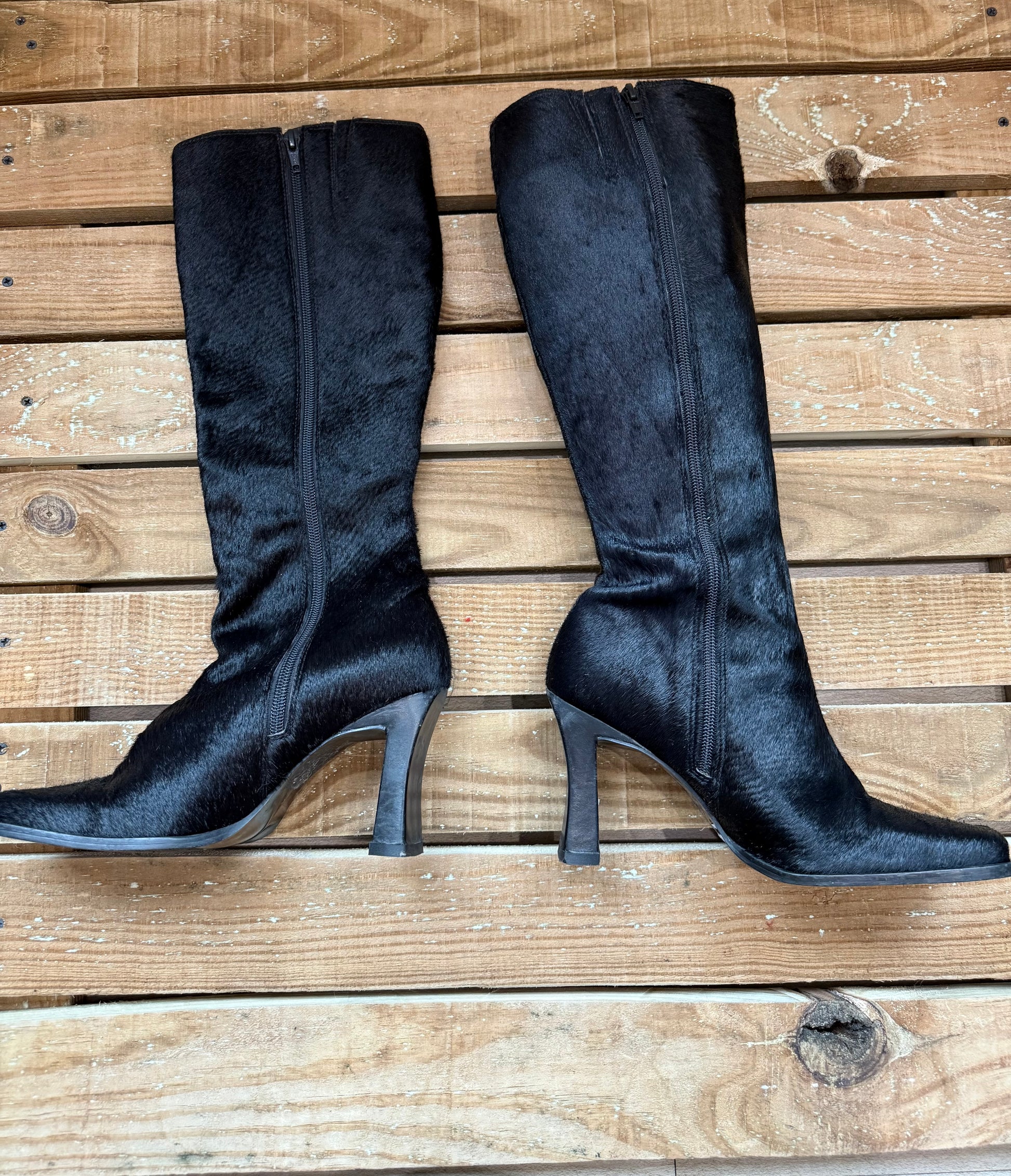 Vintage Y2K pony skin knee high boots, heeled boots. Black. Size UK5 EU38.