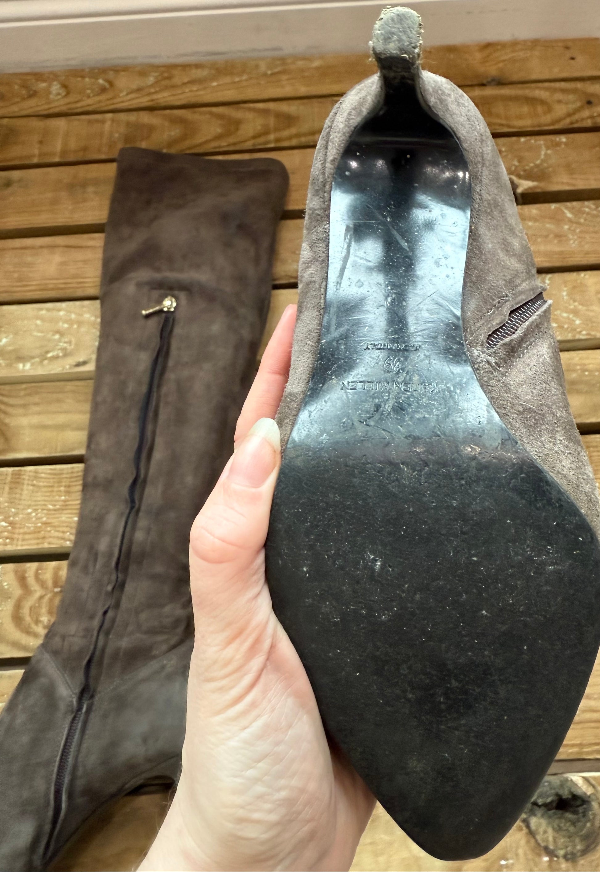 Karen Millen knee high suede heeled boots. Brown leather. Size UK6, EU39.