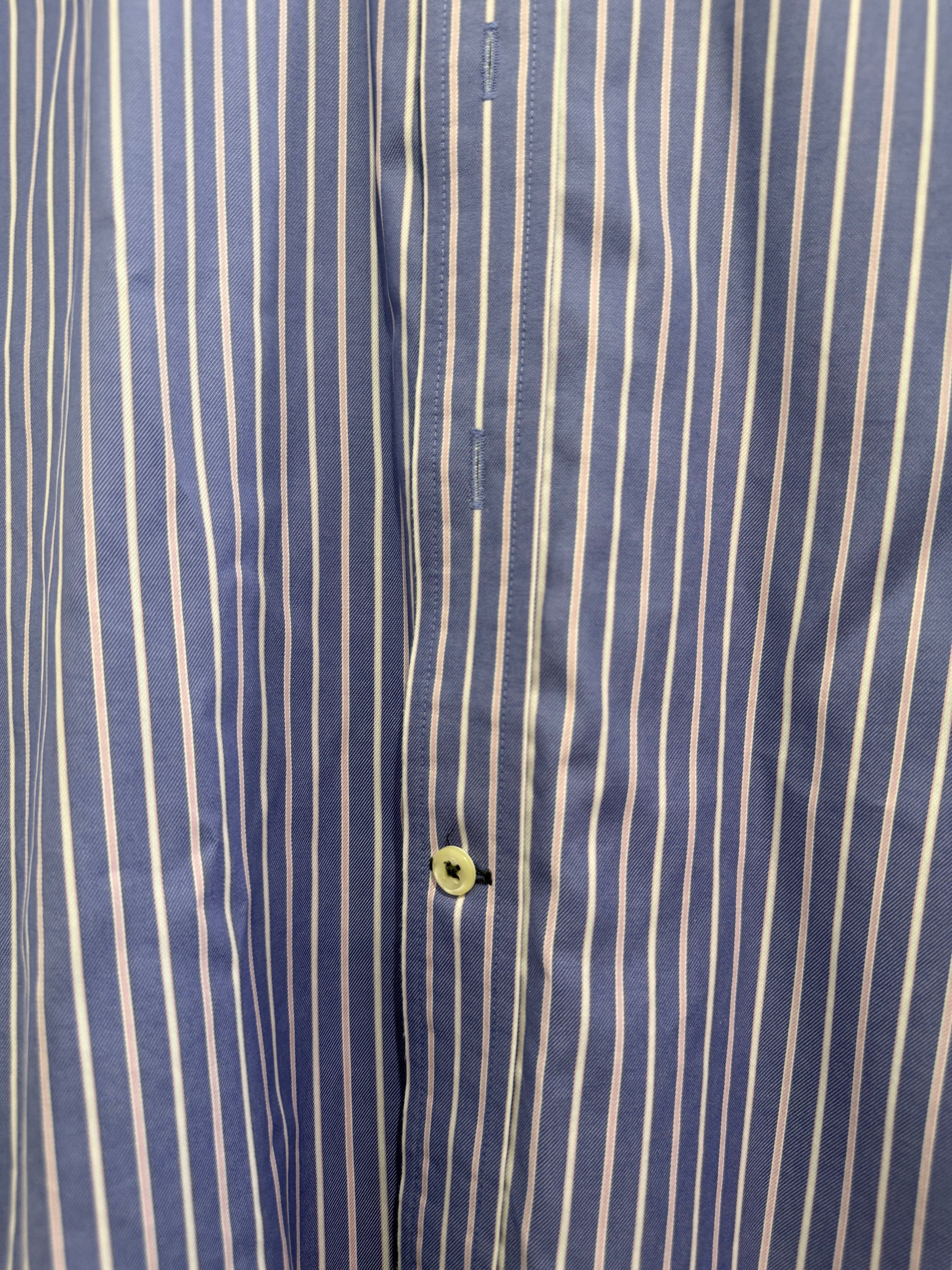 Racing Green striped shirt. Blue. 16” collar. Size Large.