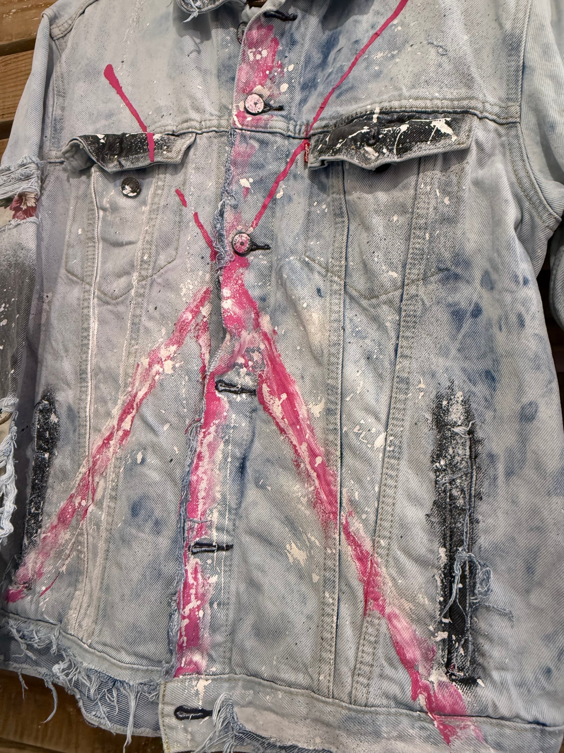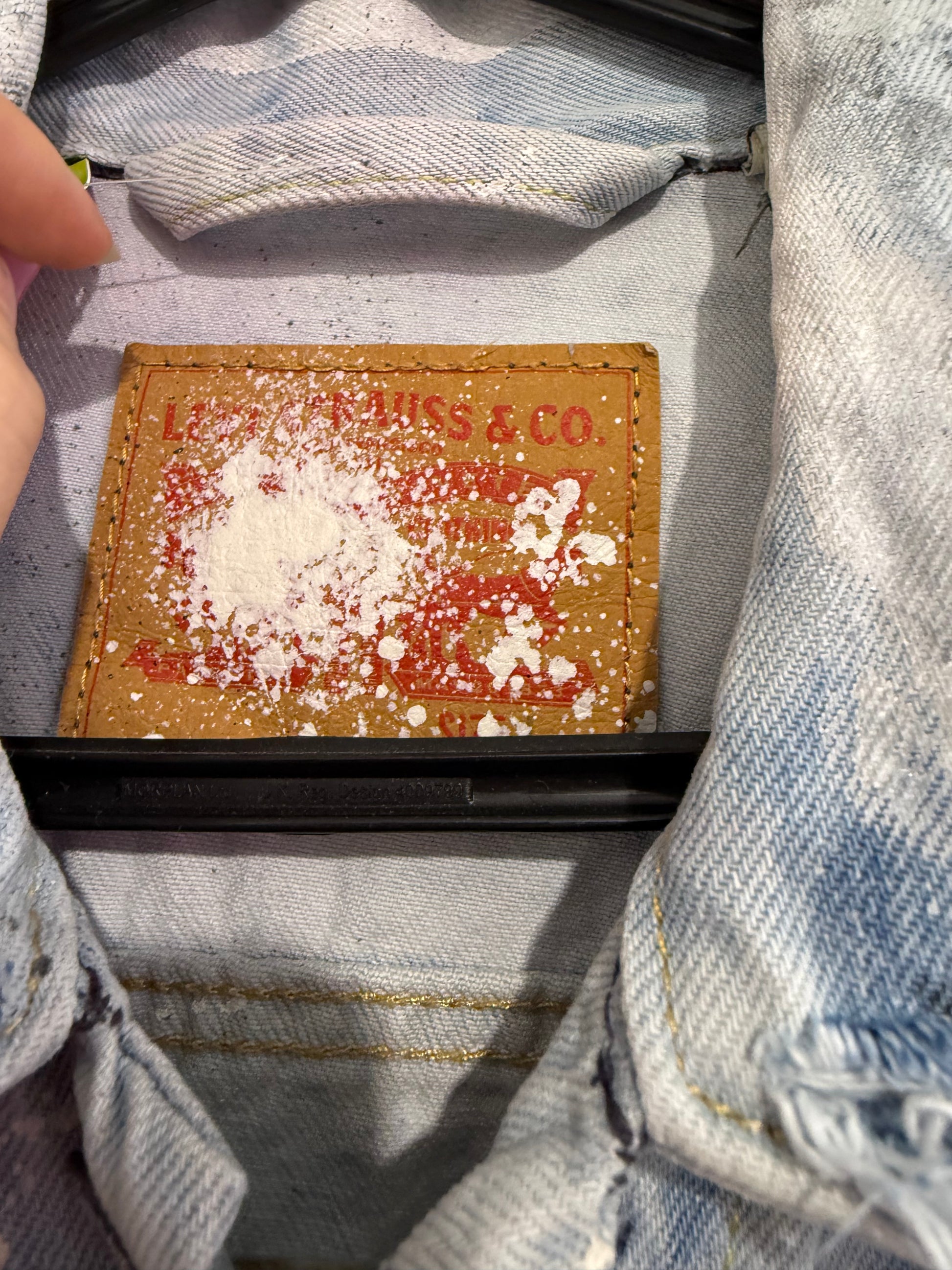 Vintage 80s Levi’s blue denim jacket. Size medium. Distressed/ painted/customised. Size Large