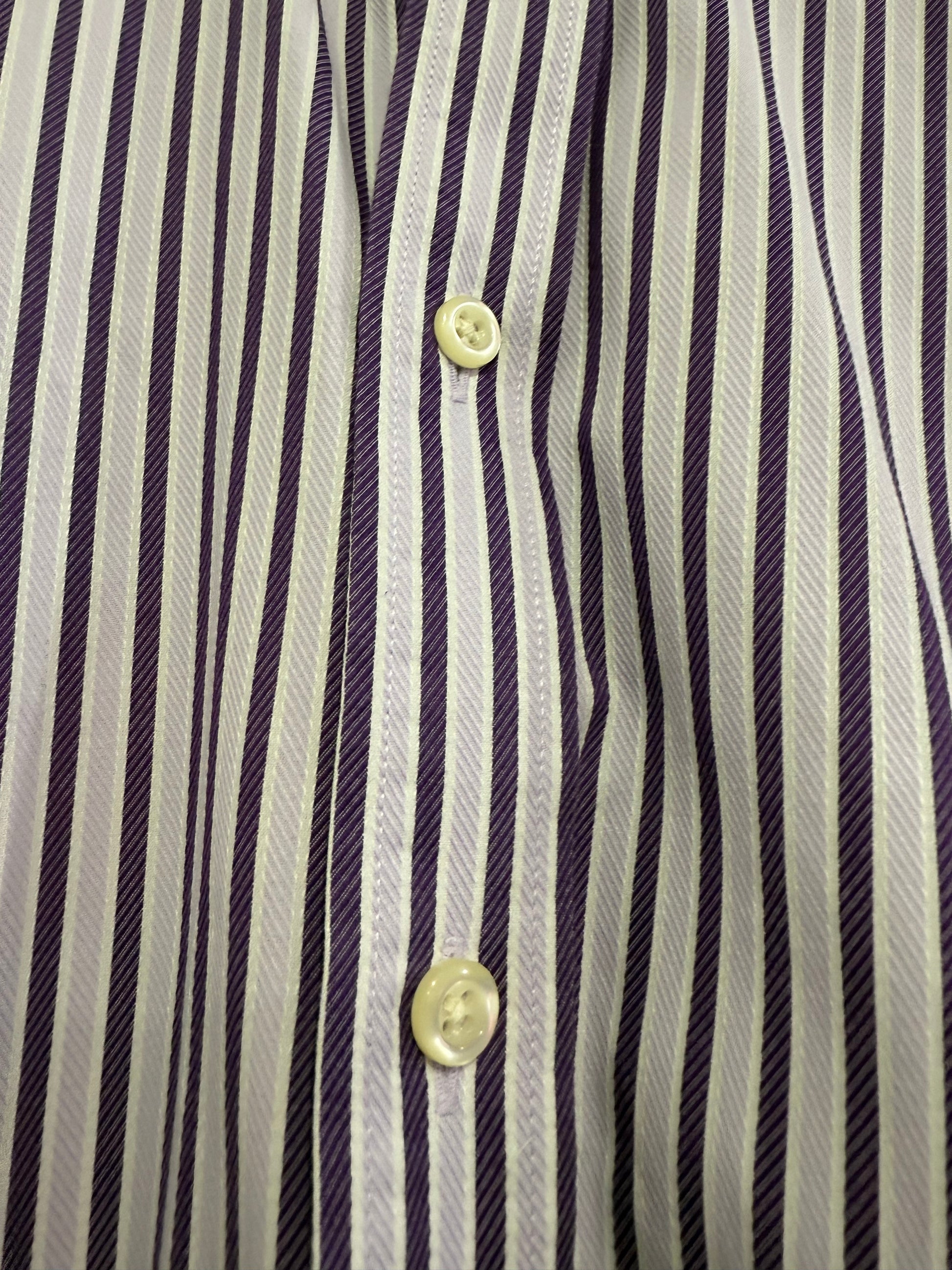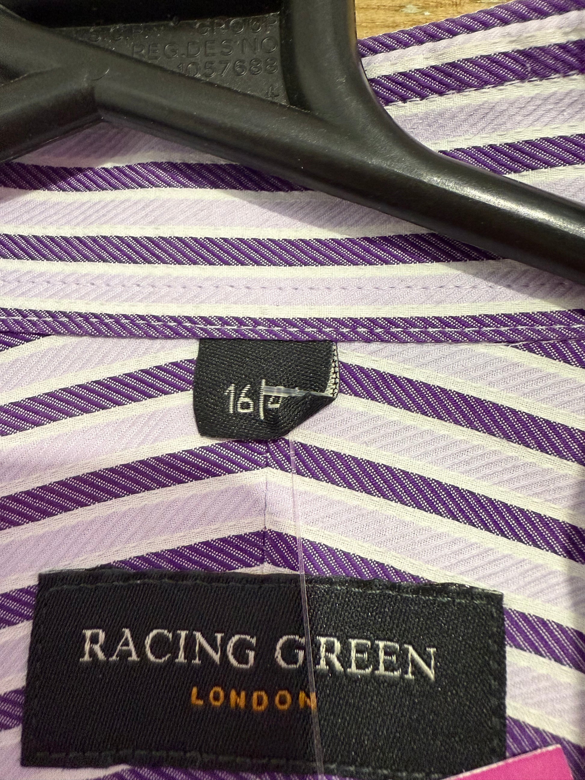 Racing Green striped shirt. Purple. 16” collar. Size Large.