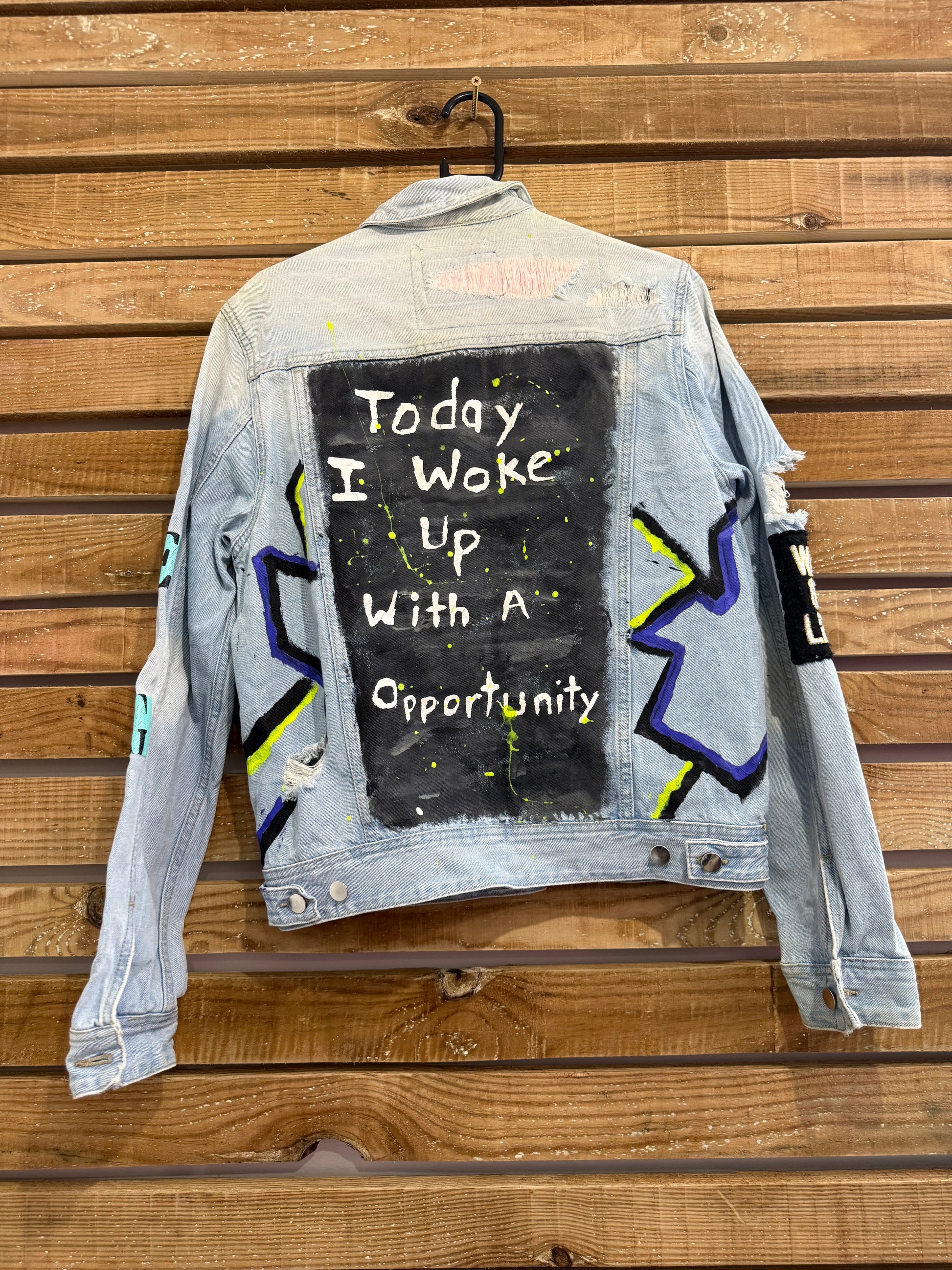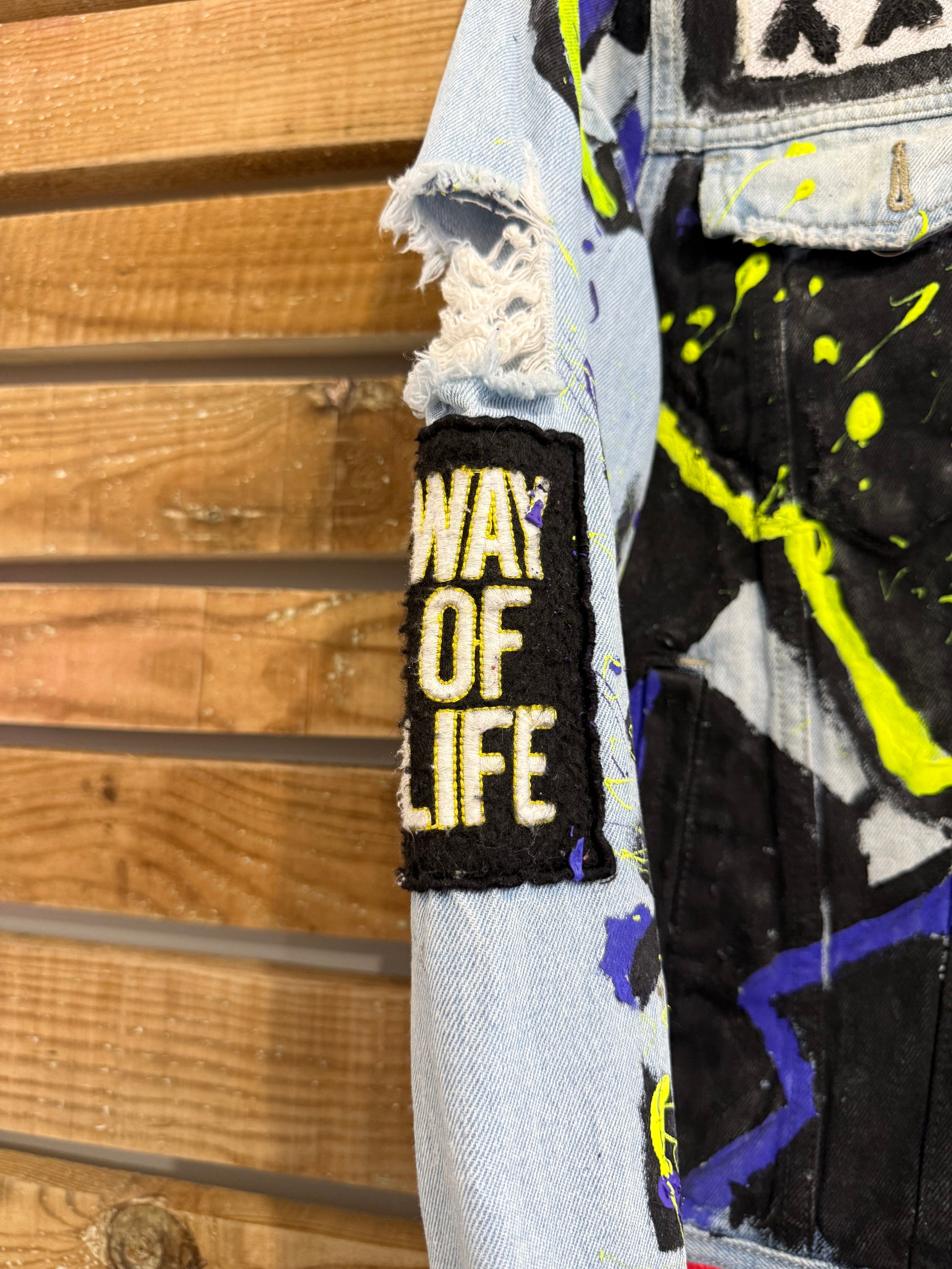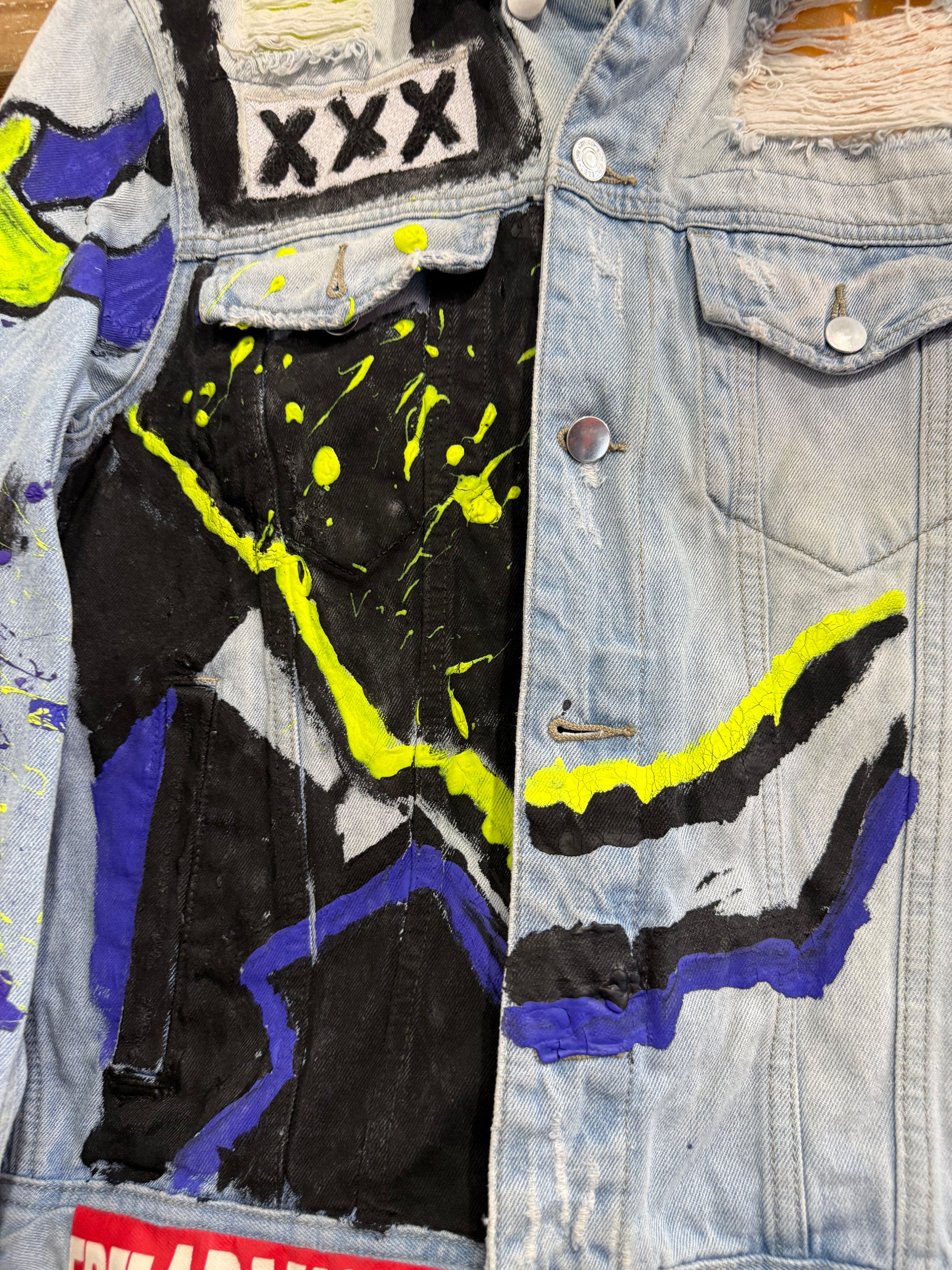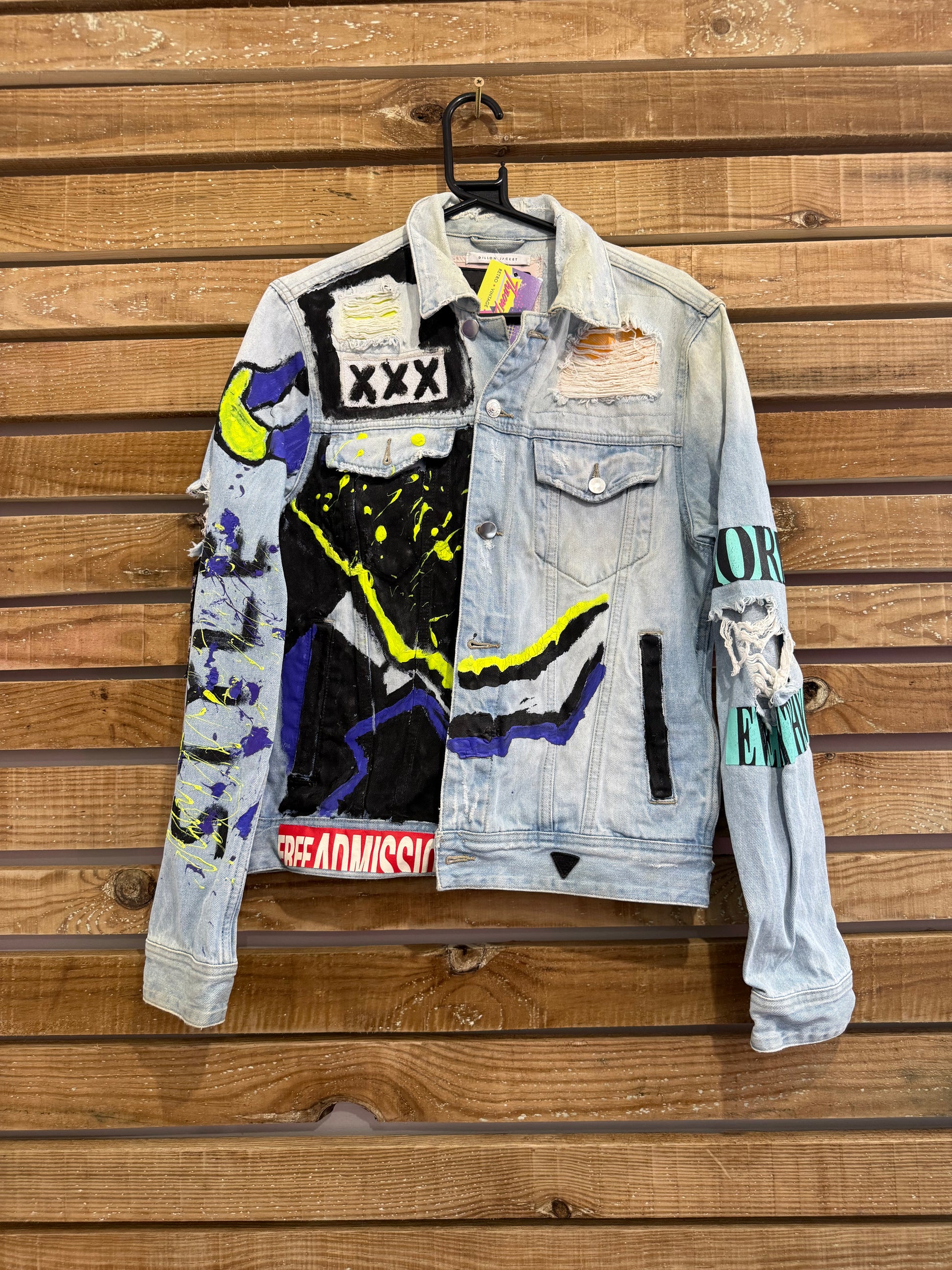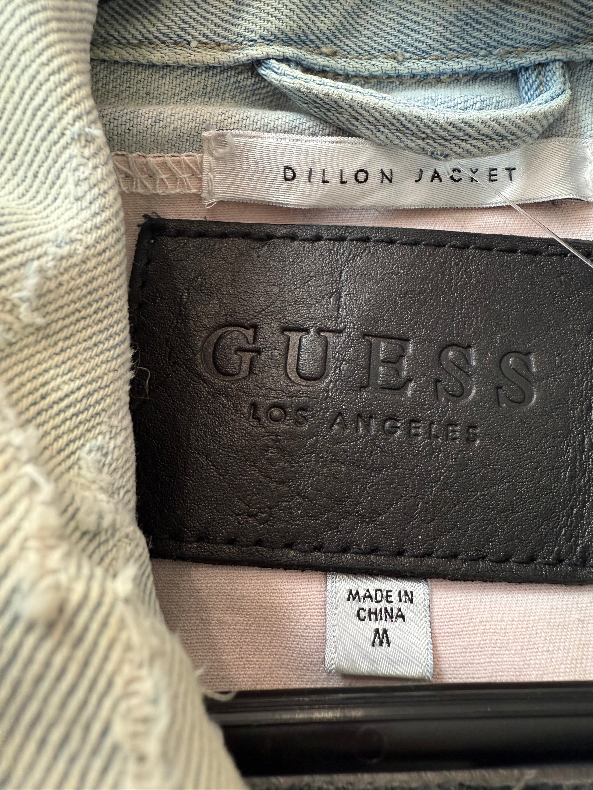 Vintage Y2K Guess blue denim jacket. Size medium. Distressed/painted. Festival.