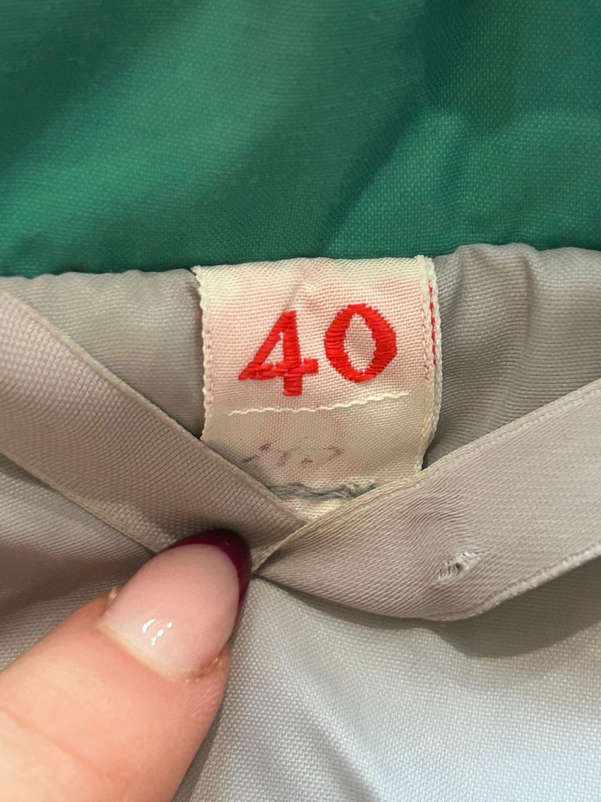 Measures a 48” chest, 37” waist, 42” hip and an 30” inside leg. So fits a modern size Large for a fitted look. Looks good more oversized too