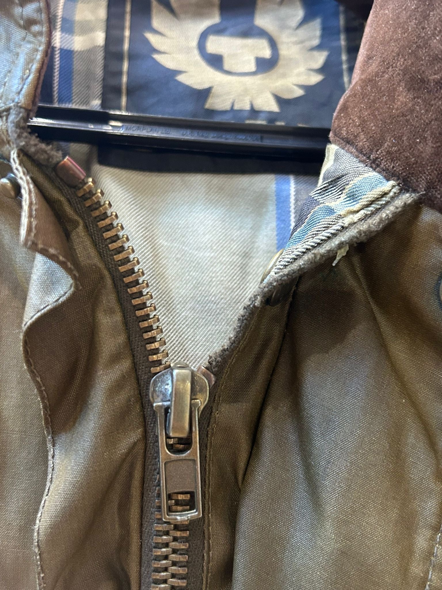 In a really nice used condition, has a nice worn patina which is what you want with a belstaff! The top of the zipper is broken so doesn’t fasten for the last couple of inches, but does up fully with the poppers if you want to close fully.