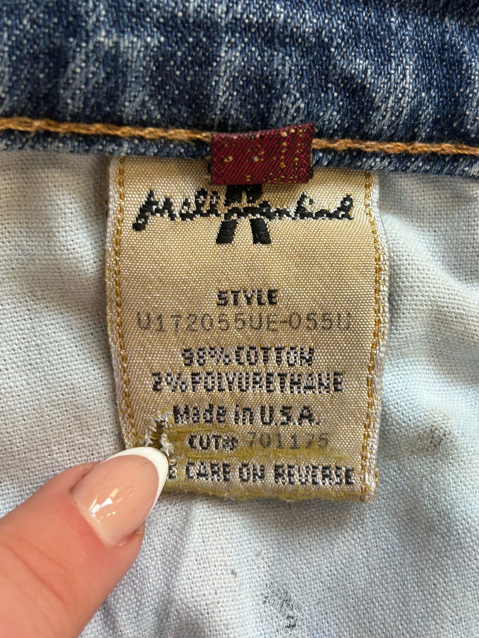 In really nice condition with no major flaws. There is intentional fraying on the back pockets, the label on the back has worn nicely. Perfect for that Y2K look.